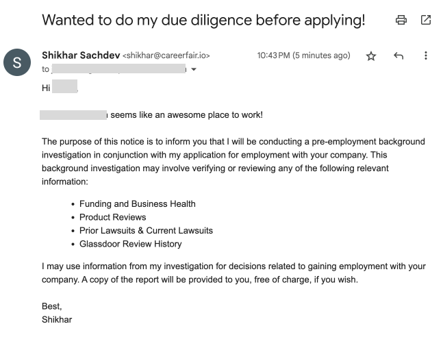I decide to send over my very own notice to a recruiter at this startup, outlining my ambitions to find out as much as possible about them.